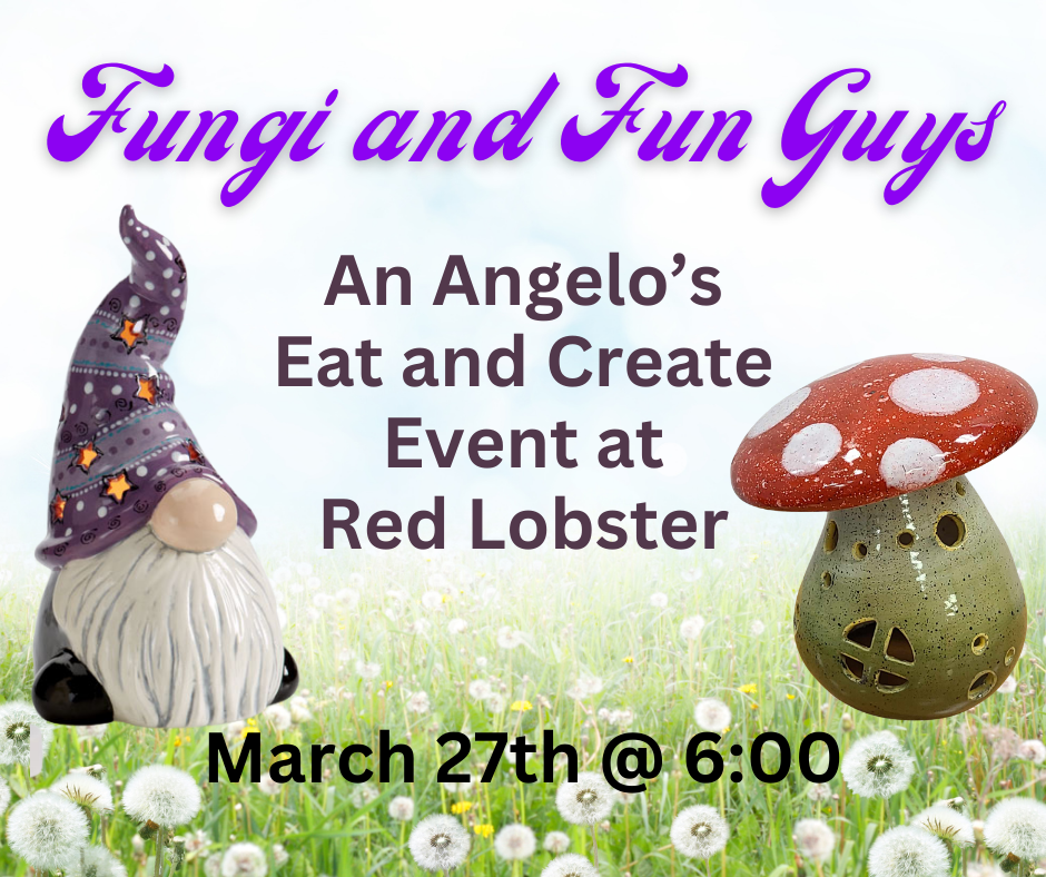 Take a break from your work week and bring your friends out to our spring event at Red Lobster! We will be bringing our best gnomes, mushrooms, and other trendy spring pottery to paint. Red Lobster will be providing a delicious three course meal — salad, a buffet dinner, and dessert, as well as a non-alcoholic beverage. Your choice of pottery and the delicious meal are all included in the cost of the event, and you can choose to purchase alcohol, if you wish! You can upgrade and choose more expensive pieces that night as well, many options, much fun. Last time, we sold out, so reserve your spot today!
