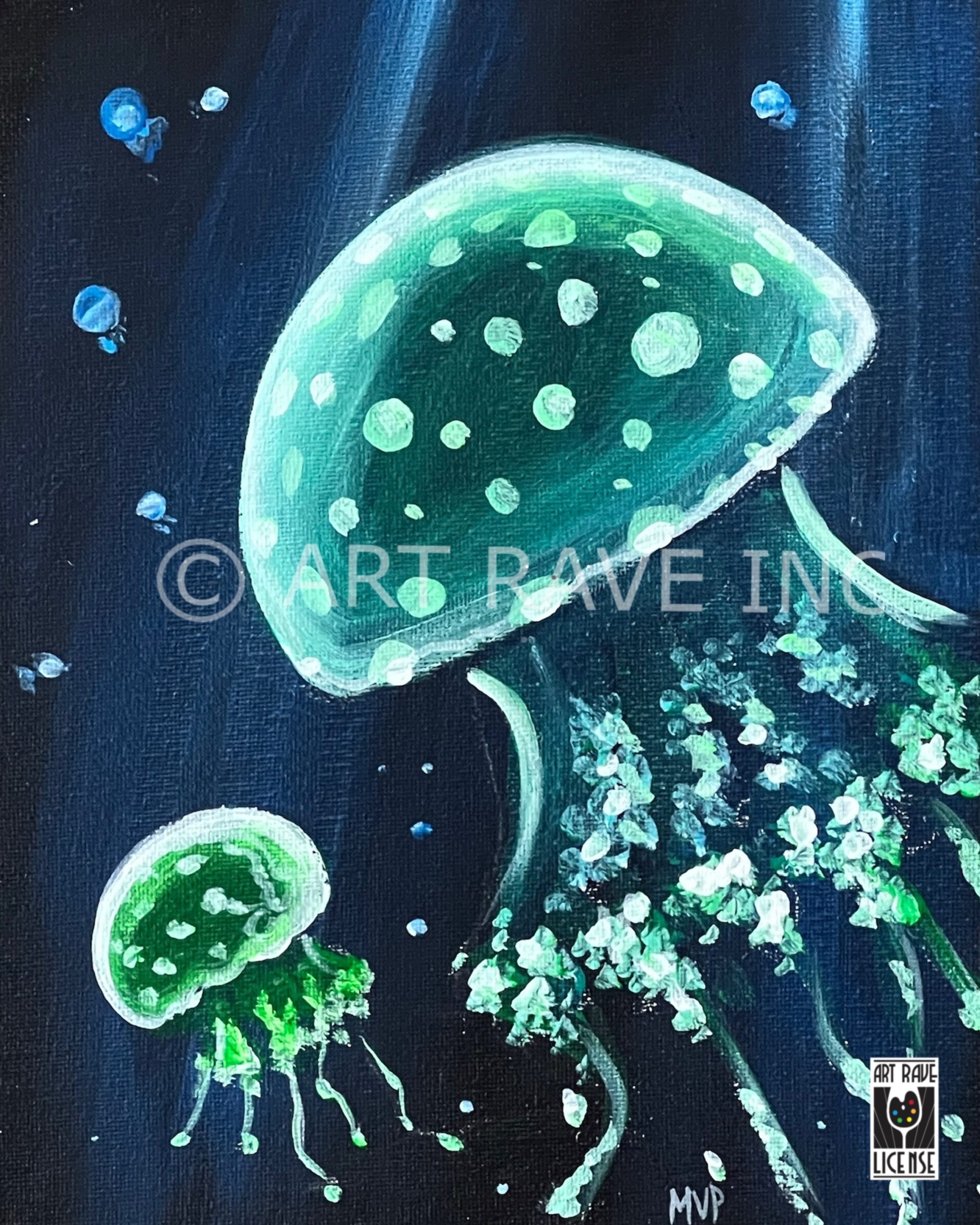 This adorable jelly fish canvas looks completely different when under a black light. It is adorable during the day and glowingly cool in the dark. (Black light is not included.)