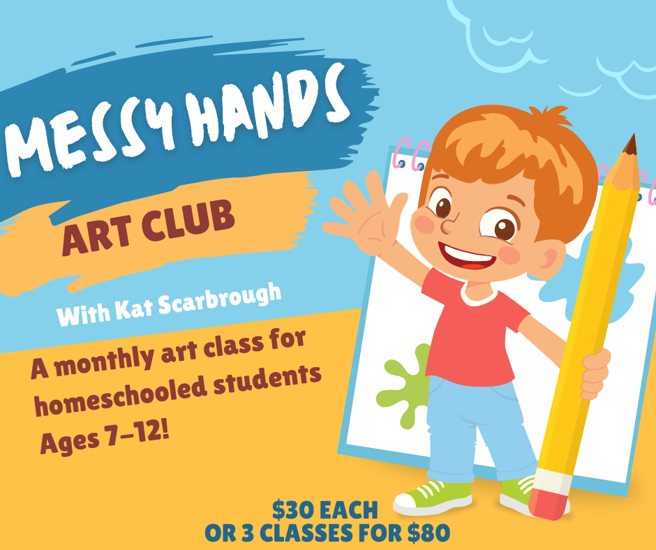 Messy Hands Art Club is a hands-on homeschool art class designed for curious, creative students ages 7–12 who love to make (and don’t mind getting a little messy along the way!). Held in our studio, this class invites young artists to explore, experiment, and build skills in a relaxed and encouraging environment.