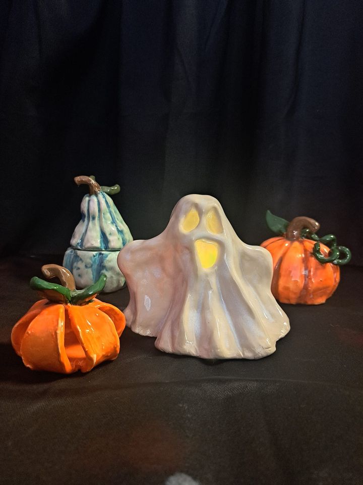 Let’s play with clay! The entire family can contribute to your centerpiece pumpkin patch. Bring your loved one and make more of these delightful pumpkins. Your other family members can create one of the ghosts. Kill two holidays with one event! Create them tonight and pick a convenient time to glaze them in before fall. Then you can use them to decorate your Halloween events and your Thanksgiving table. Enjoy great conversation and create a memory worth savoring every year. Bring your loved ones and create an entire patch of pumpkins or a whole gaggle or ghosts. One pumpkin or ghost comes with the class, but additional pieces can be made for an additional charge.