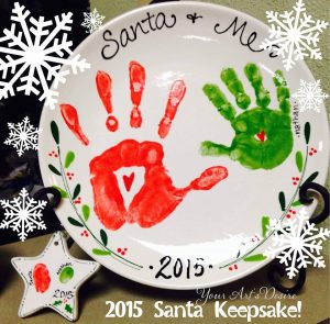 Santa is visiting. Come in and take photos, sit on Santa’s lap, and create a handprint plate that has Santa’s print and the child’s as well. Our artists will decorate and do the calligraphy so that this becomes a family memory piece. We will have light breakfast food (breakfast pastries, fruit, and hot cocoa) for everyone. Come spend some time with Santa. You can paint an ornament if you wish. Choose either a mug or a plate.
