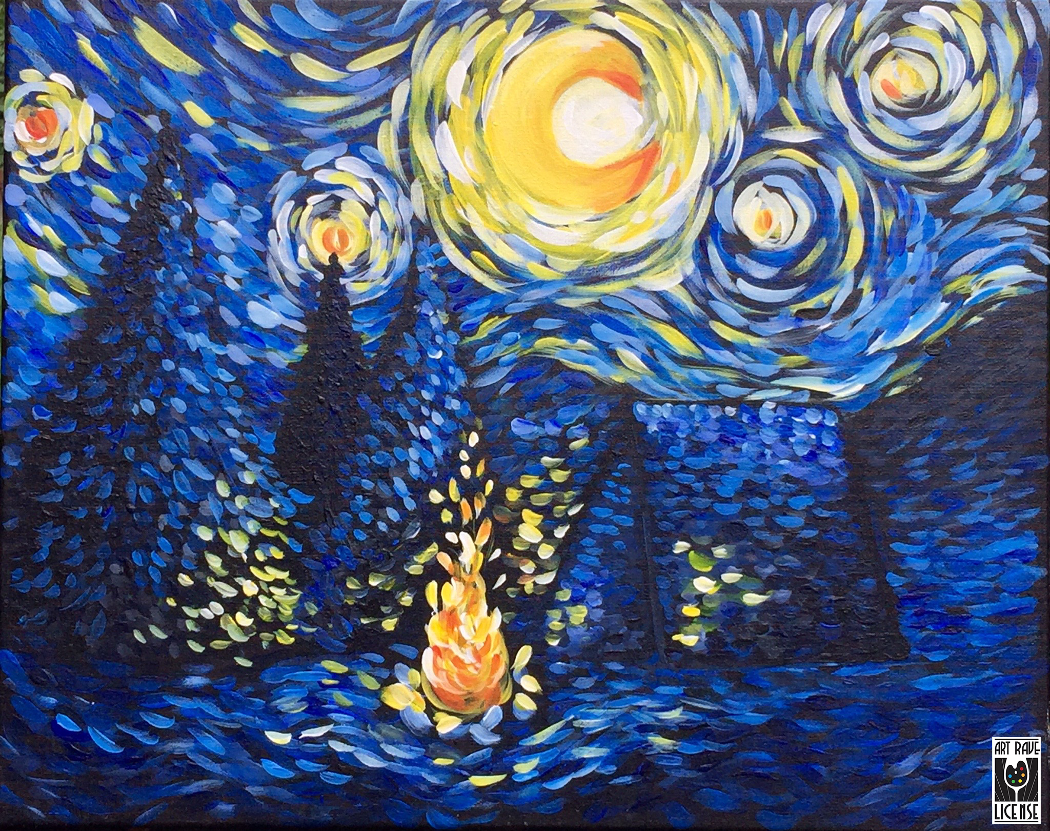 Van Gogh’s Starry Night! This class will be canvas and acrylic paints, so wear clothing that you can get