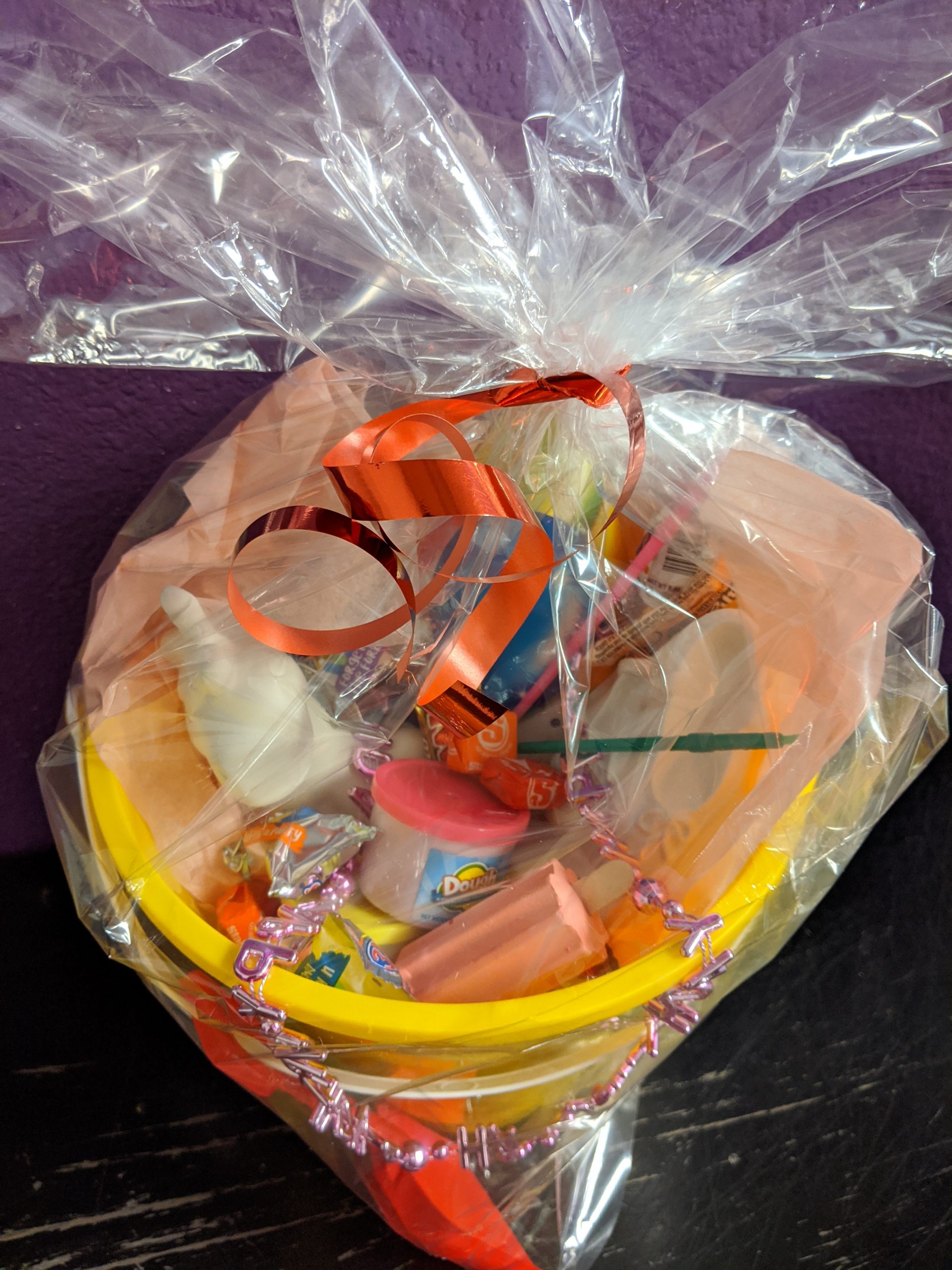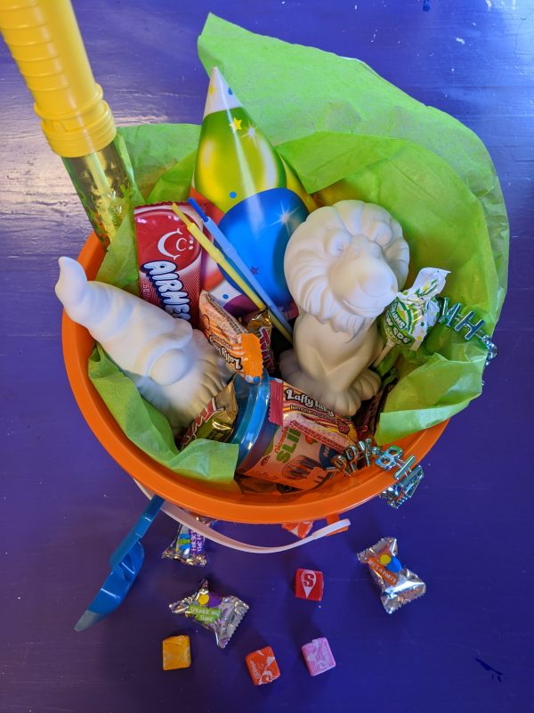 Follow the directions carefully to order. Show your love with this amazing little kit which contains two party animals of your choice, brushes, paint, and a few basic kid treats: some sweets, a birthday chain, bubbles or play dough or slime or sidewalk chalk. Use Coupon Code: Birthday Basket Discount. You choose two party animals and color (please select from the Party Animal category on the right), and we package them in a child’s bucket with a shovel and a few of the items above. A lovely package for a great at home experience. For an older child, we can substitute a different basket for the bucket and shovel. Use Coupon Code: Birthday Basket Discount. After the discount your full price will be $40.