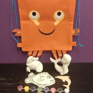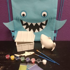 You get this fantastic, super cute shoulder pack and an assortment of themed activities that go along with the bag. You do not get to choose the pieces, trust us to put a great kit together for you. 16 different kits altogether. Kits include brushes, glazes, paints, a disposable apron. and even a few sweets. Additionally, we will punch your card for you 5 times and call you when it is ready for pick up. How great is this!!!