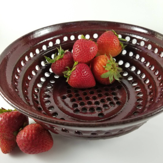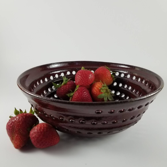 Beautiful deep red spiral berry bowl. This piece would make a lovely gift and a great addition to any kitchen. Made from Black Mountain stoneware clay, hand-thrown on a pottery wheel, and hand-glazed by a local artist. Approximately 8in diameter. Dishwasher, oven, freezer, and microwave safe.