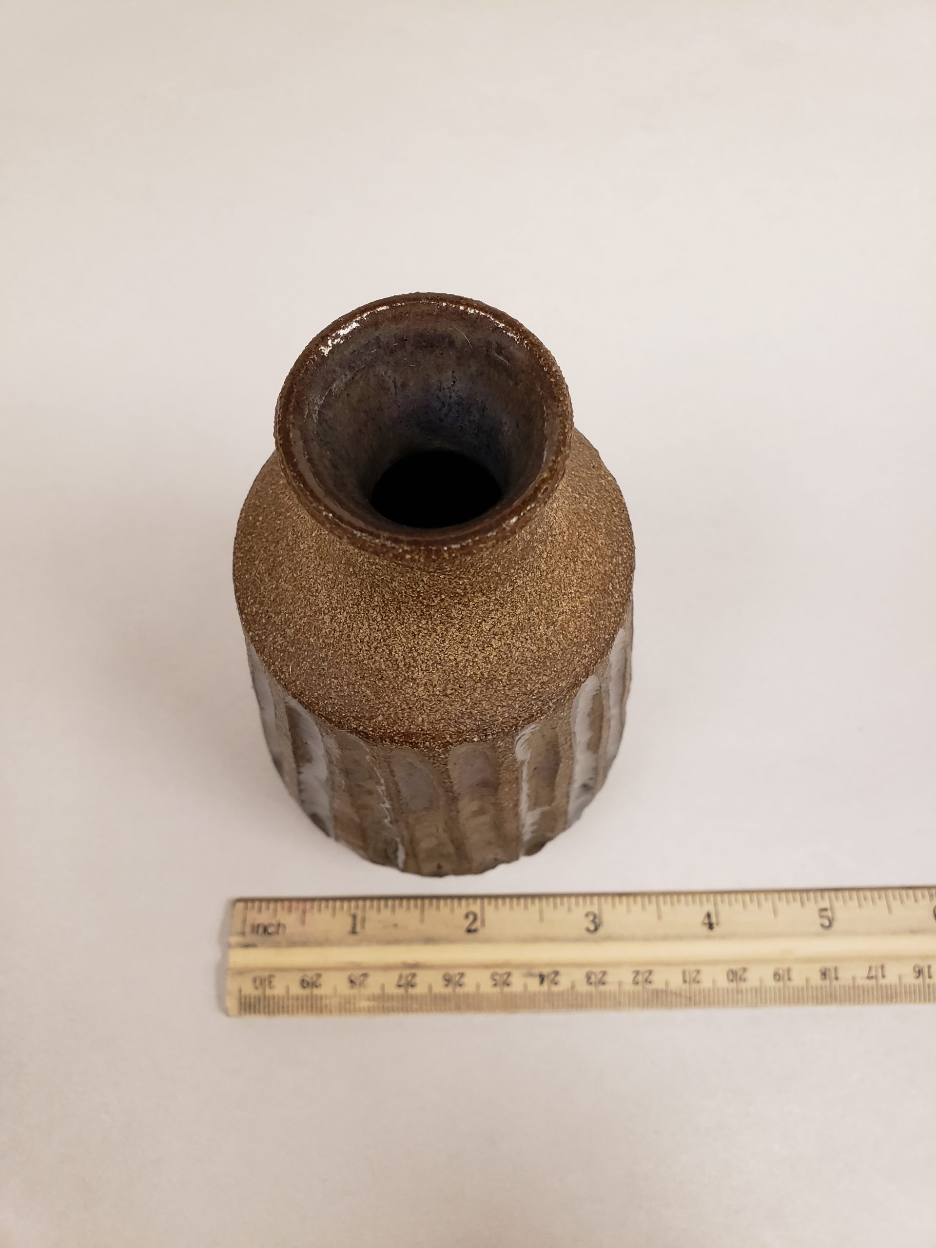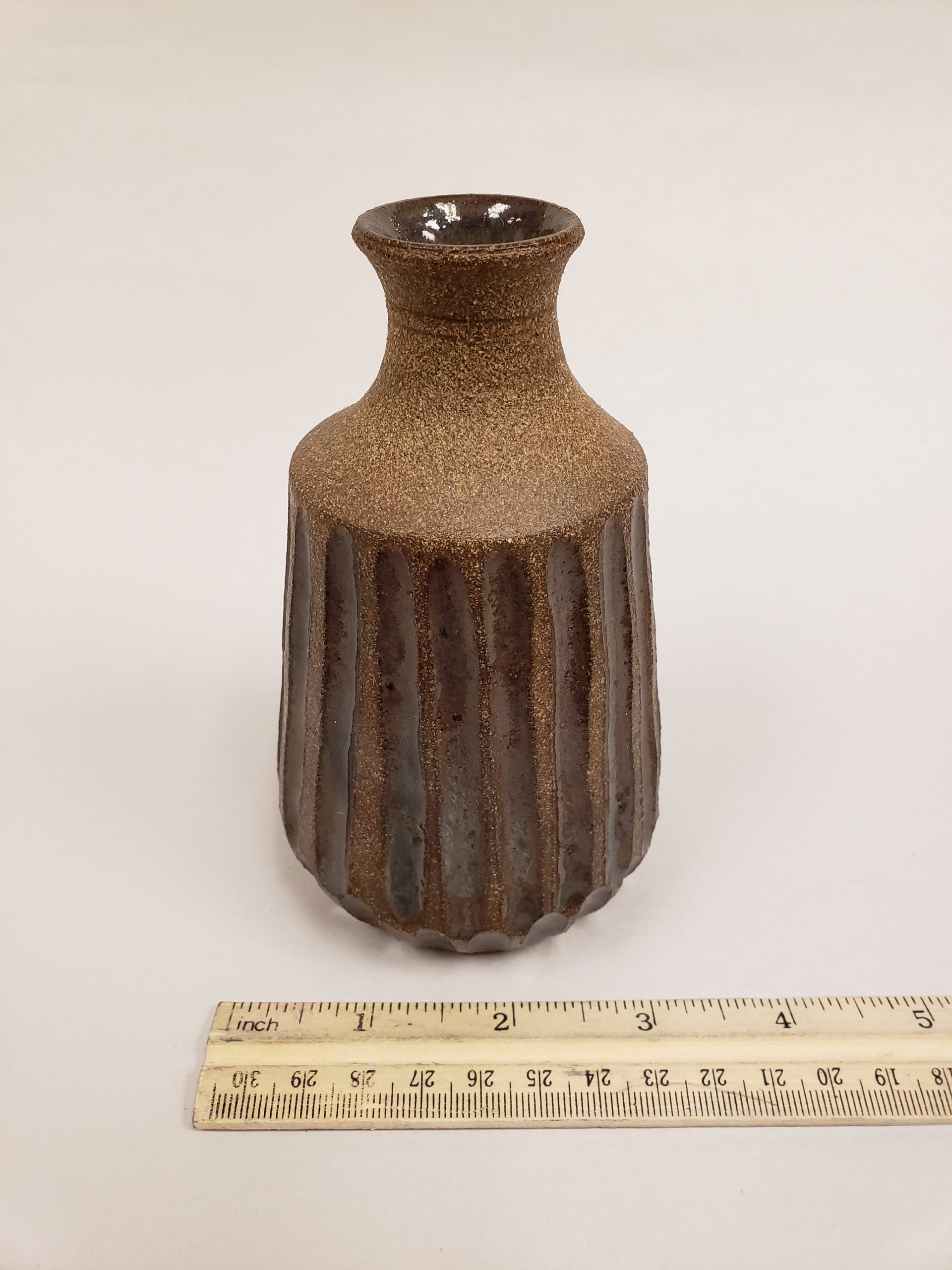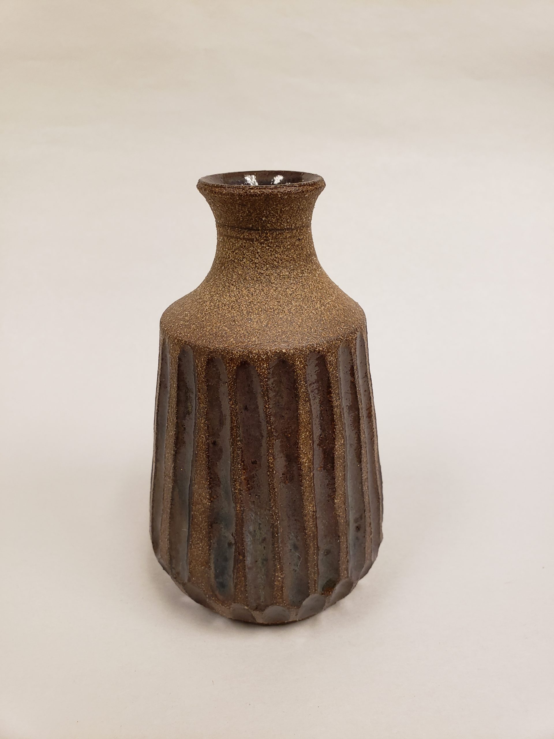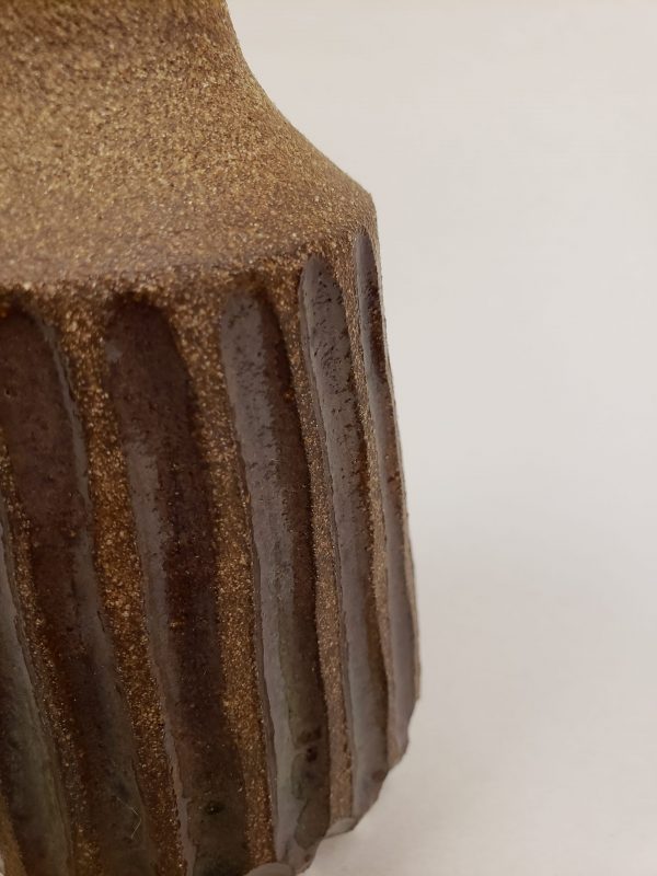 This single stem vase is simply adorable. It features a deep purple glaze in the vertical carvings. Perfect for a beautiful solidary flower.
