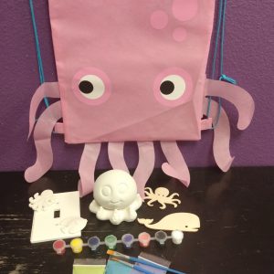 You get this fantastic, super cute shoulder pack and an assortment of themed activities that go along with the bag. You do not get to choose the pieces, trust us to put a great kit together for you. 16 different kits altogether. Kits include brushes, glazes, paints, a disposable apron. and even a few sweets. Additionally, we will punch your card for you 5 times and call you when it is ready for pick up. How great is this!!!